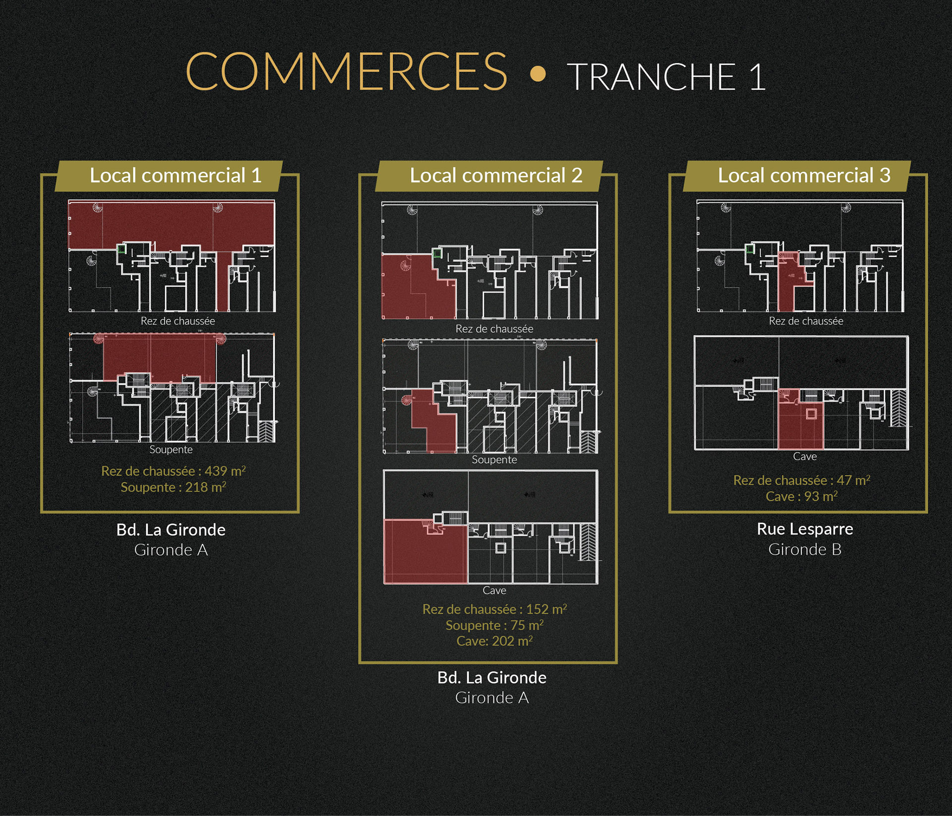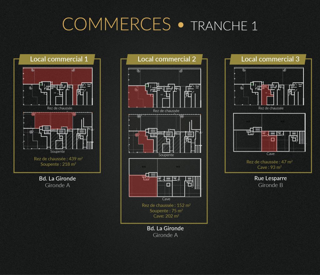 Le projet offre également des opportunités exceptionnelles d’achat ou de location de locaux commerciaux au Rez-De-Chaussée incluant pour certains commerces un espace d’entreposage au sous-sol ainsi que l’accès à une place de parking.