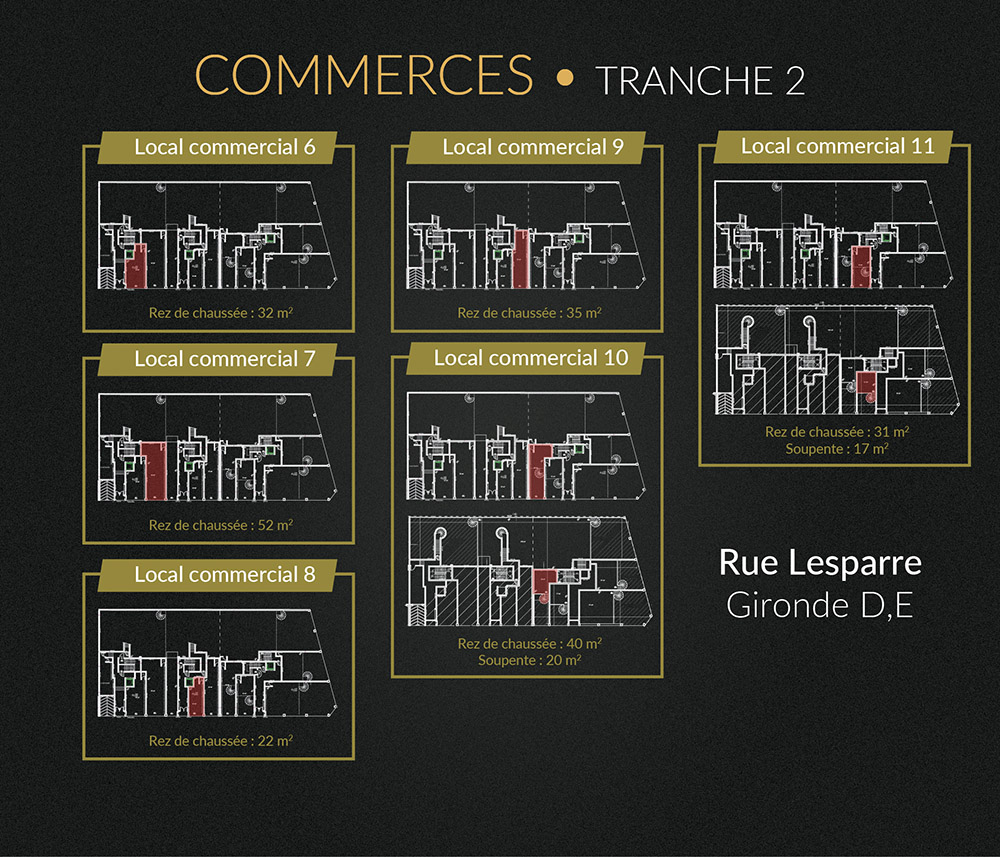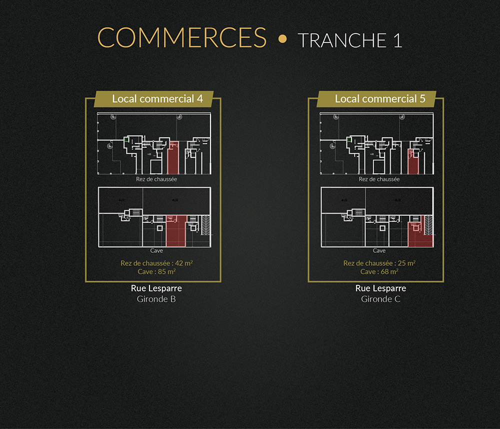 Le projet offre également des opportunités exceptionnelles d’achat ou de location de locaux commerciaux au Rez-De-Chaussée incluant pour certains commerces un espace d’entreposage au sous-sol ainsi que l’accès à une place de parking.